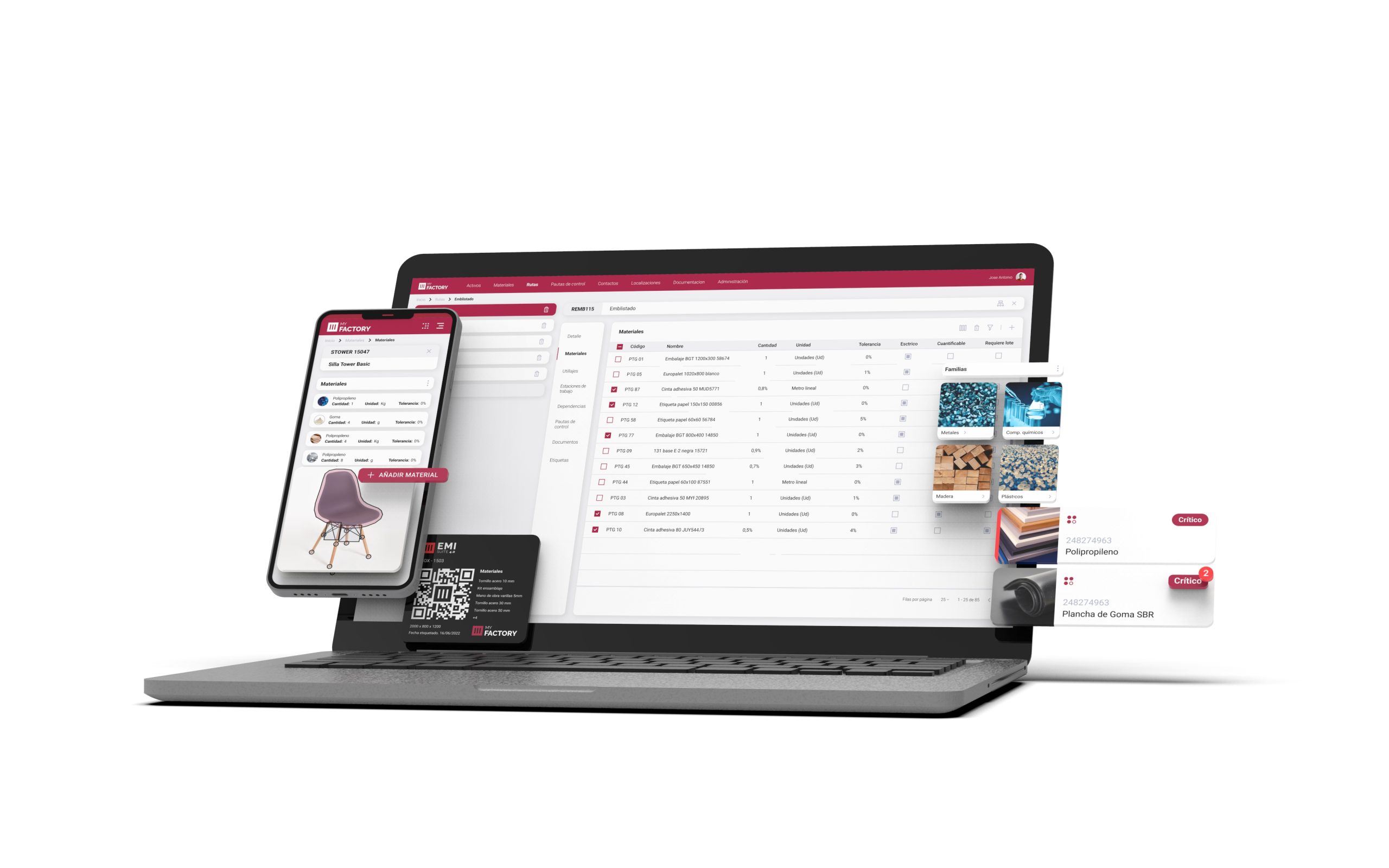 My Factory permite la configuración de todos los elementos transversales relacionados con la gestión de la fábrica que llevan a cabo los procesos productivos. Detalla la lista de referencias y su composición, listado de materias primas, utillajes, herramientas, rutas de fabricación, activos, turnos disponibles…